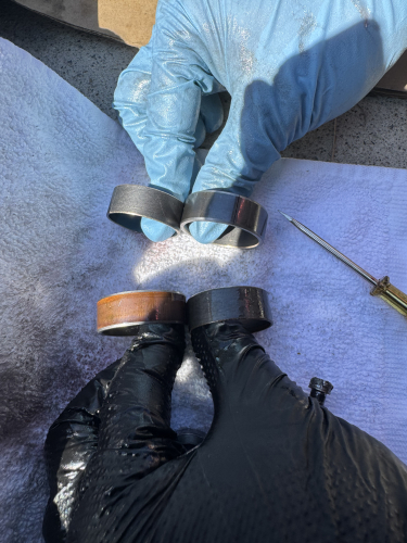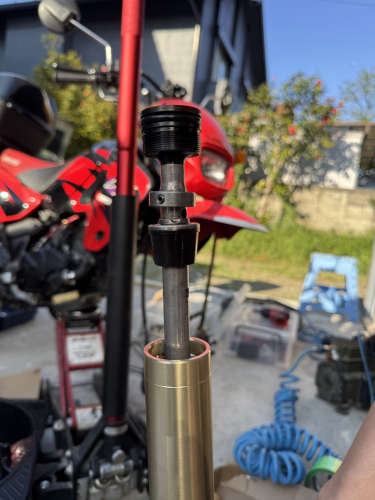 表面のコーティングが剥がれ、下地の銅色がはっきりと露出していました(写真参照)。これではスムーズなストロークは望めません。シール交換と併せて、これらの消耗品も新品へリフレッシュします。